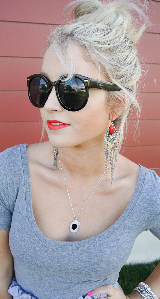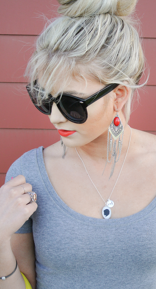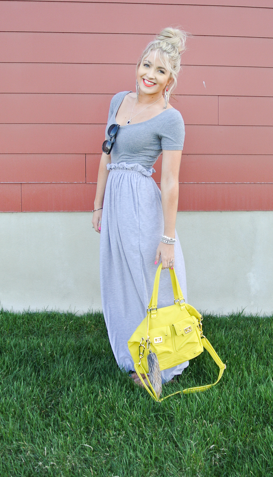 I am loving this chill yet not chill outfit! I clearly love maxi skirts but look at how fun this one is! It’s not just an ordinary maxi, it’s a maxi with a little twist which is always good! You can tuck the ruffle in, wear it high waisted, wear it on your hips, pretty much you can wear it however you would like haha but i am loving the ruffled high waist look! AHHH and this purse, I mean are you dying!! It’s perfect right!? It’s that citrus color that is so in for spring and exactly what I have wanted! It makes a simple outfit like this pop just because of a purse, and it looks great with a bright red lip, I would say it’s the perfect purse for me! Oh and make sure you scroll down for an amazing giveaway! It involves one of my favorite pieces of jewelry!