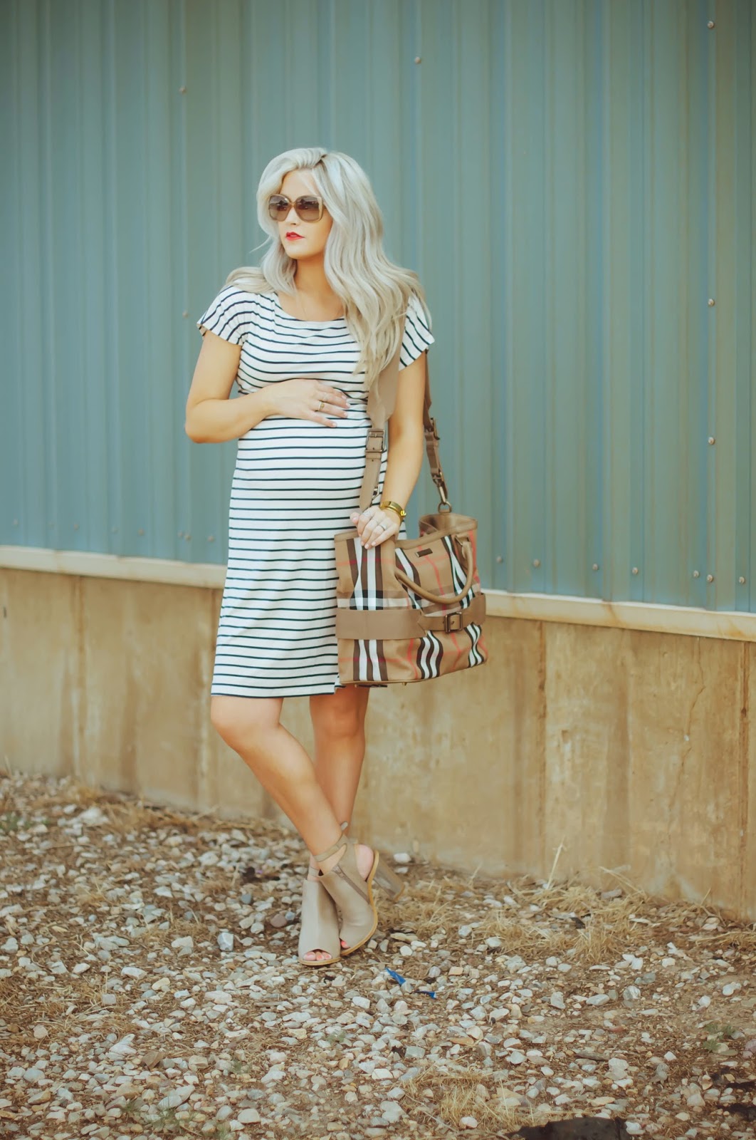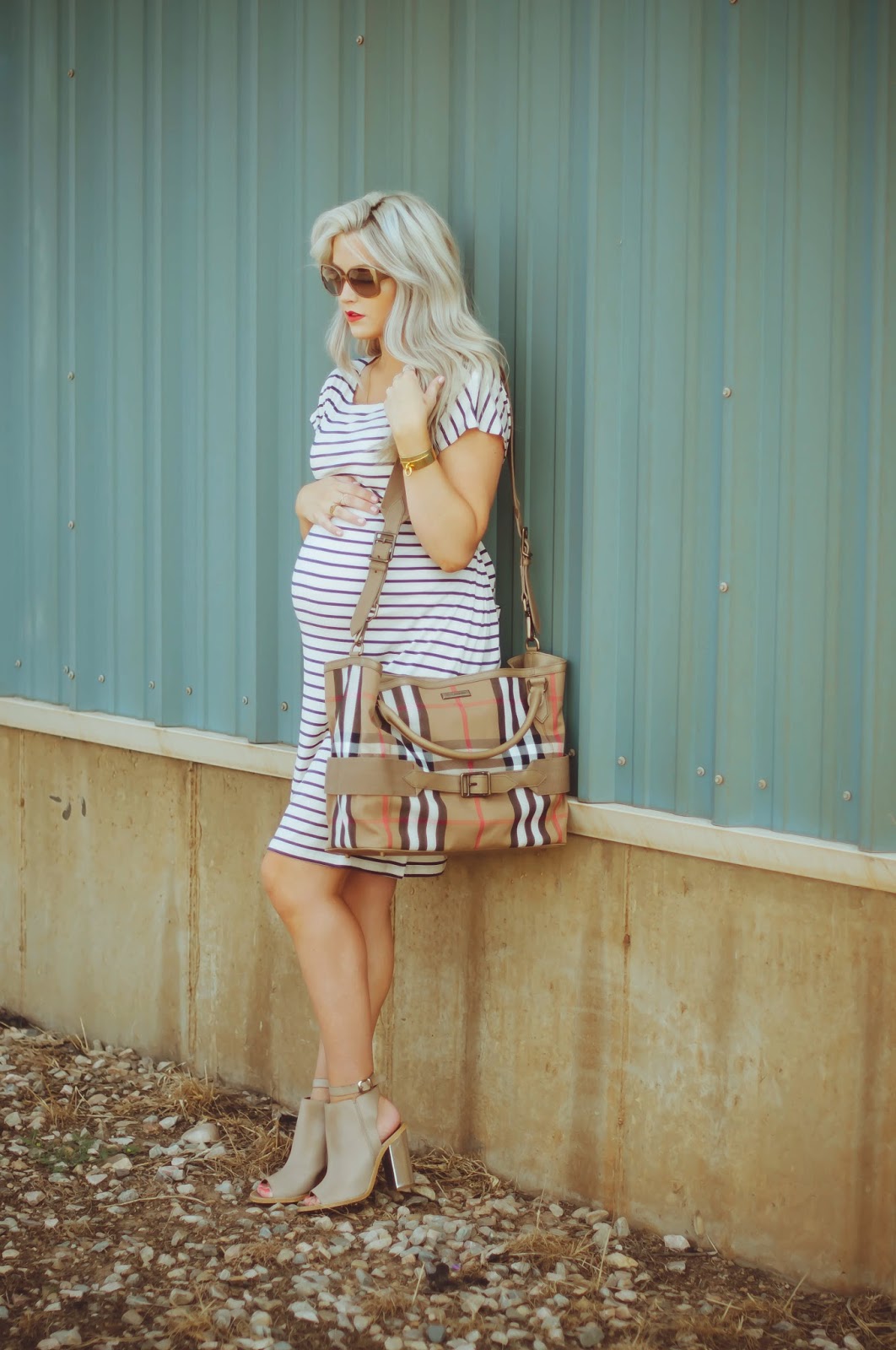 This look is all about the patterns….I mean let’s be honest, you can wear anything with this Burberry diaper bag and it will look pretty amazing! This specific bag is from Alex and Alexa and I can’t wait to use it all the time when little man comes. It is that perfect combo of a diaper bag/tote purse and exactly what I was wanting. I really could just start using it every day right now, but I am going to wait until he comes to have it be an everyday bag. Now, that being said, I’m sure you will continue to see if before he comes, because I just can’t resist it. These heels have also been a favorite of mine this pregnancy because they fancy up and outfit, but they are still comfortable, and have a good ankle strap that allows me to wear them longer than 20 minutes. Comfort has been a major stress for me this pregnancy, but I am still trying to feel fashionable and cute at the same time. Pieces like the ones in this outfit below help me to achieve that.