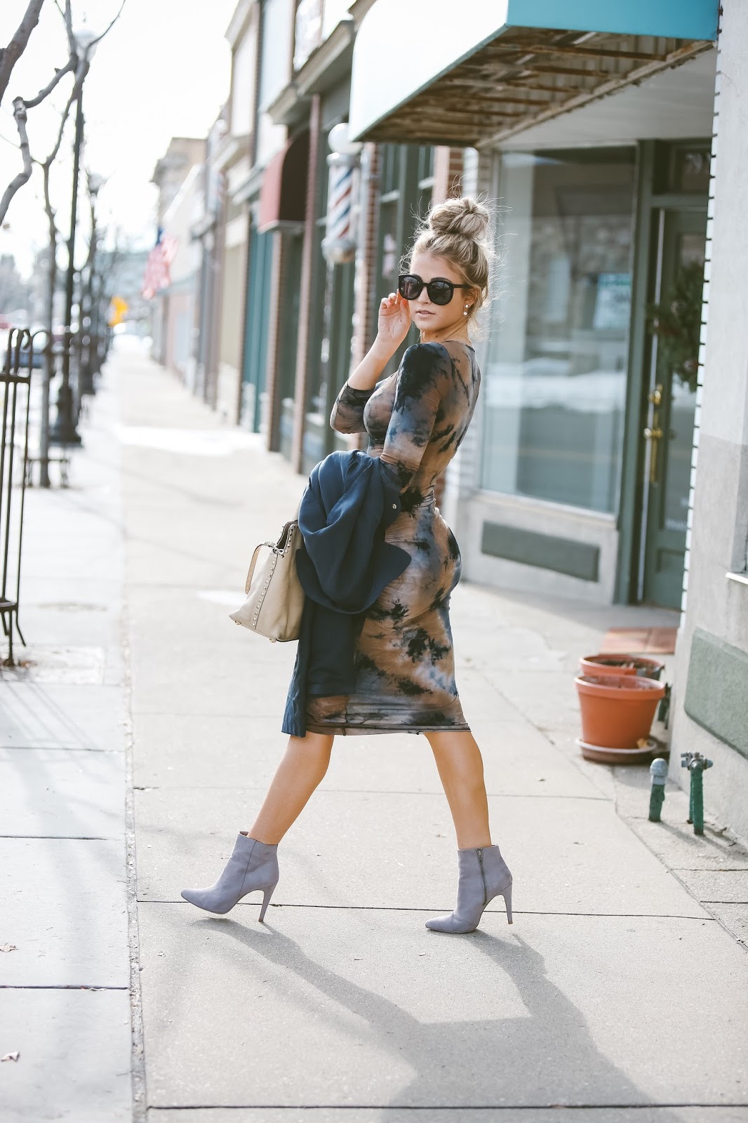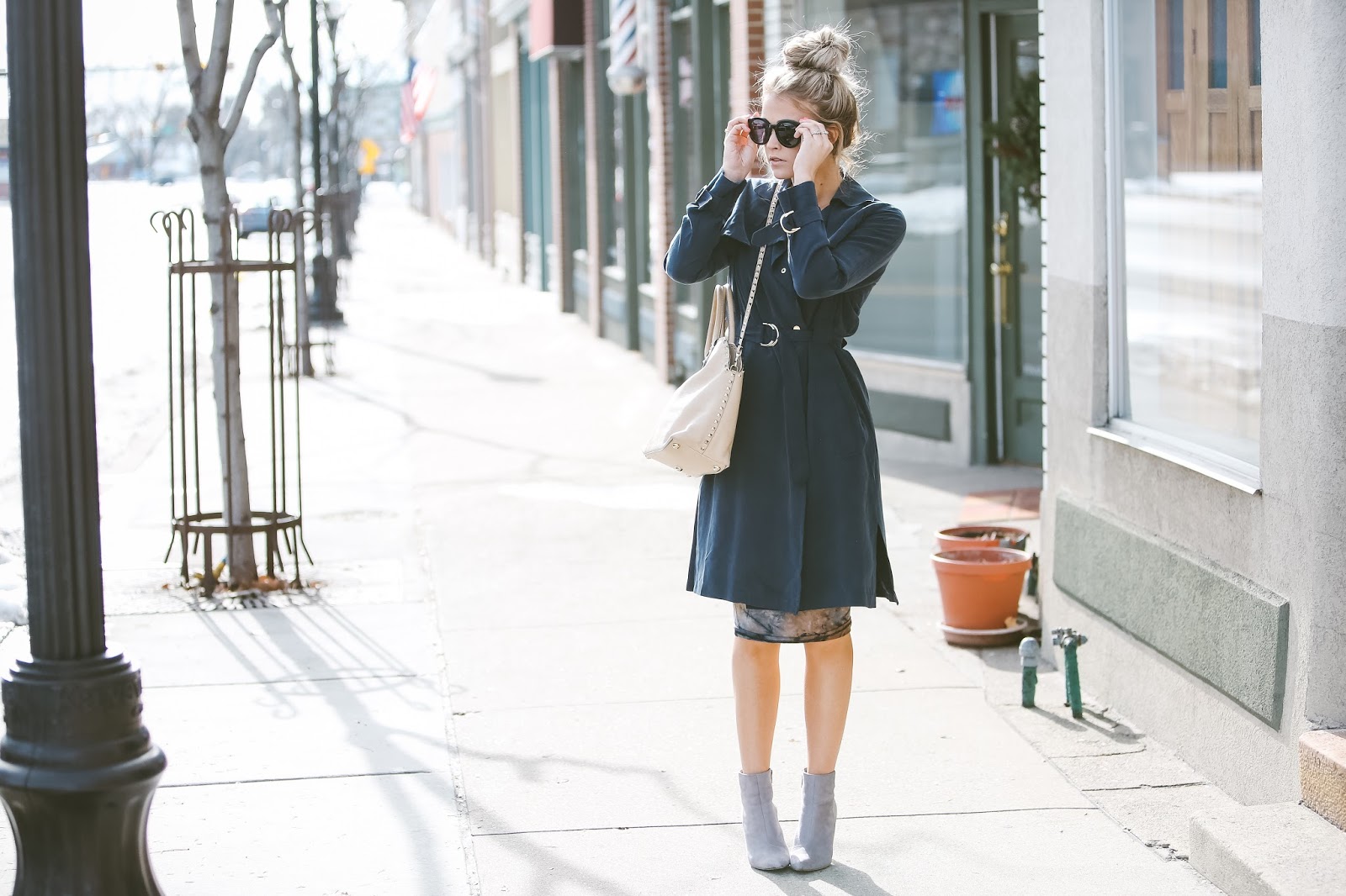 I am all about a comfortable/cozy dress, and this dress was exactly that! I paired it with these grey booties and classic blue trench, and I ended up loving the combo. I literally had two minutes to do something to my awful hair this day, so a top knot was the only answer. It’s usually my go to hairdo when I am having one of those frustrating hair days…and sometimes it work, and sometimes it doesn’t haha.