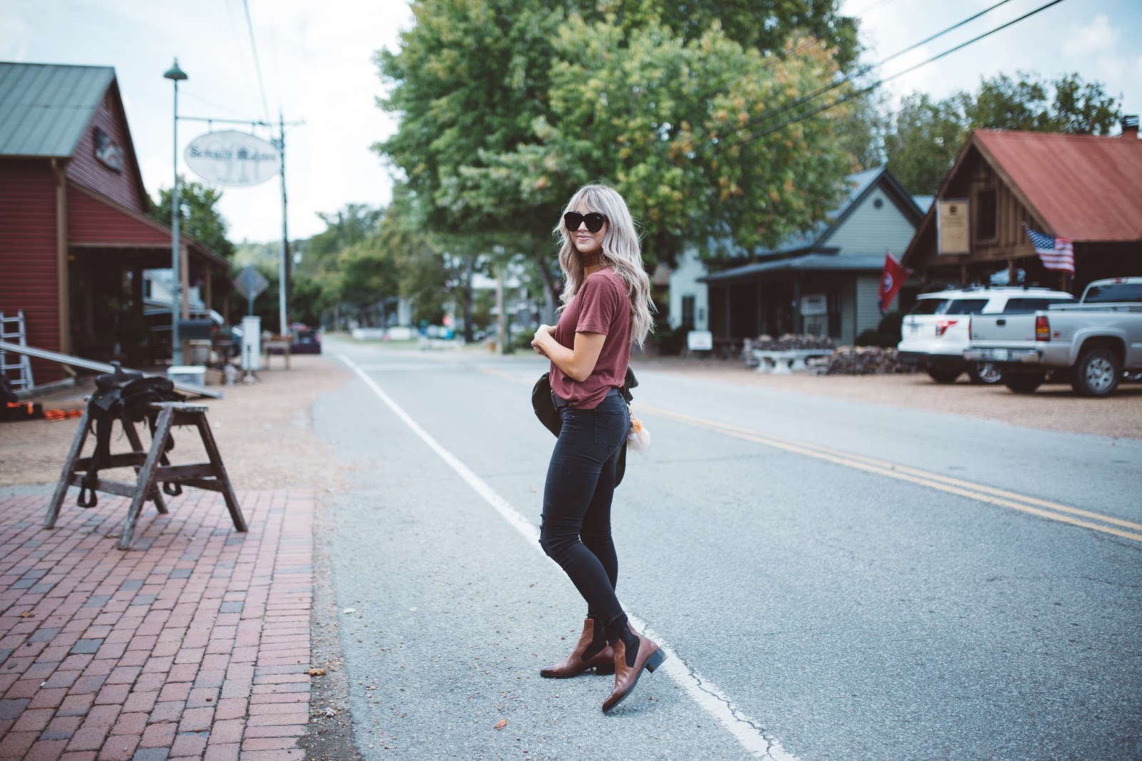 Hello to all you beautiful people! Today’s post takes us back to the South, to a little place called Leiper’s Fork. This little town/village is about a 40 minute drive outside of Nashville and was such a cool little place to visit! On our final day in Nashville, after some breakfast at the Pancake Pantry (the sweet potato pancakes were amazing!), we headed out to the countryside to spend some time in Leiper’s Fork. The drive itself was pretty awesome, the winding road took us past some of the coolest homes that had yards that seemed to go on for days and days. Every tree and all the grass and vegetation was vibrant green and it seemed like such a great place to live. Leiper’s Fork itself is a quaint little town that you will miss if you close your eyes for 15 seconds haha! We parked and wandered around the antique and art shops, stopped for a snack at Puckett’s Grocery, and chatted about what it would be like to live in a place like that. It was a wonderful day and I always love to see new places and explore new towns, it reminds me of how much beauty there is in the world and how many different places there are that people call home. The look for this day of exploring was one of my go-to’s for the Fall…a comfy top, jeans that I love, and some boots that I saw and had to snag them! I love that they work with any color and can be a staple footwear item for the season. I have linked them below, so check them out! Thanks for reading, thanks for following, and I hope you all have a fantastic day!