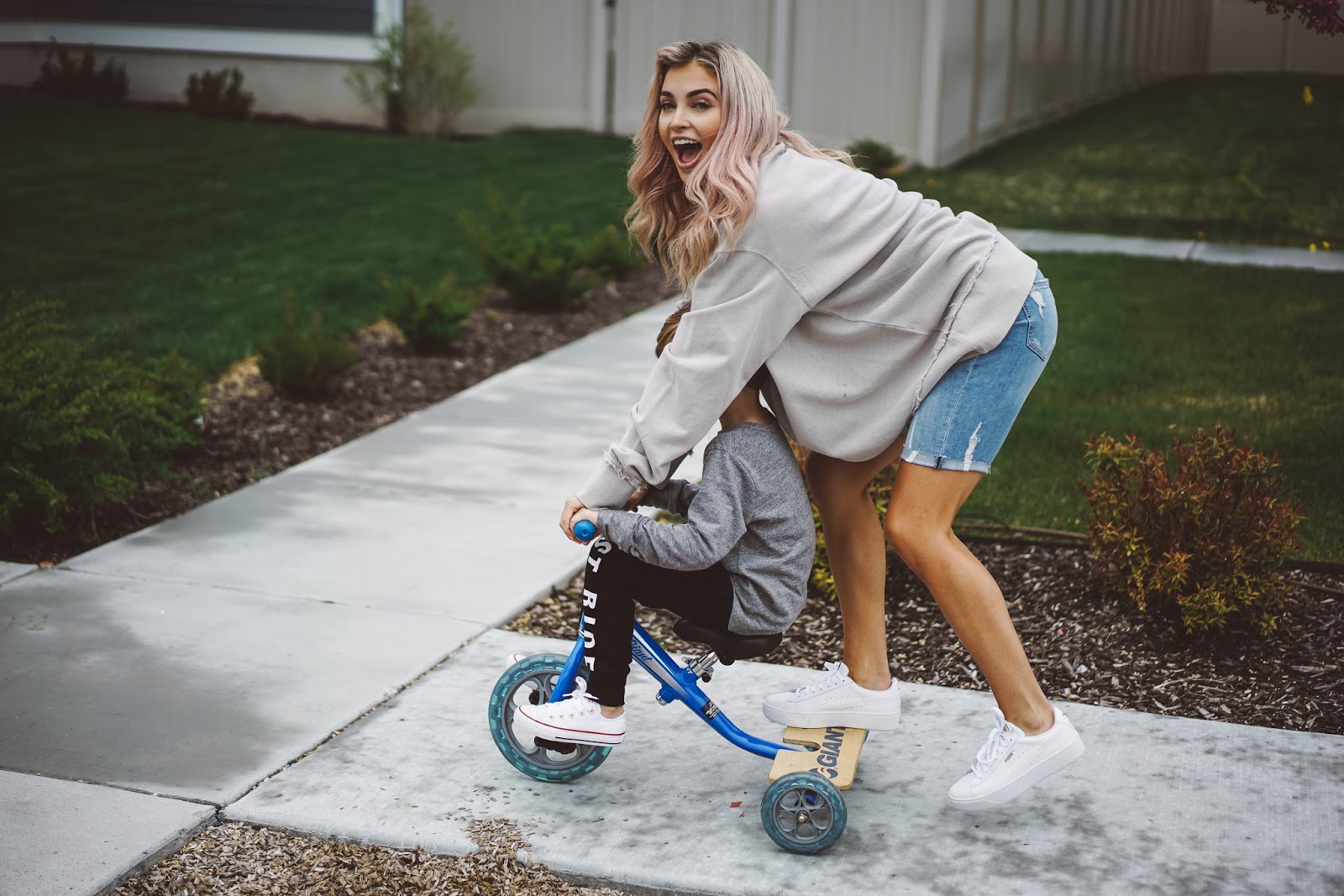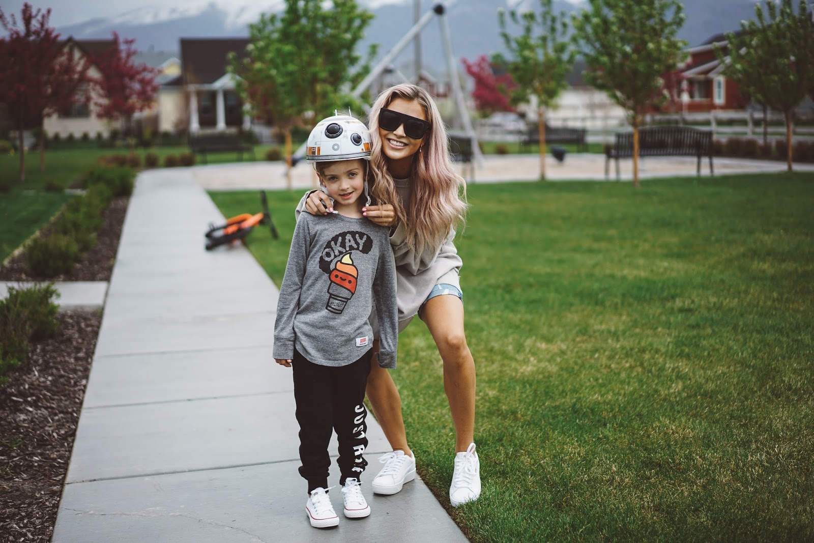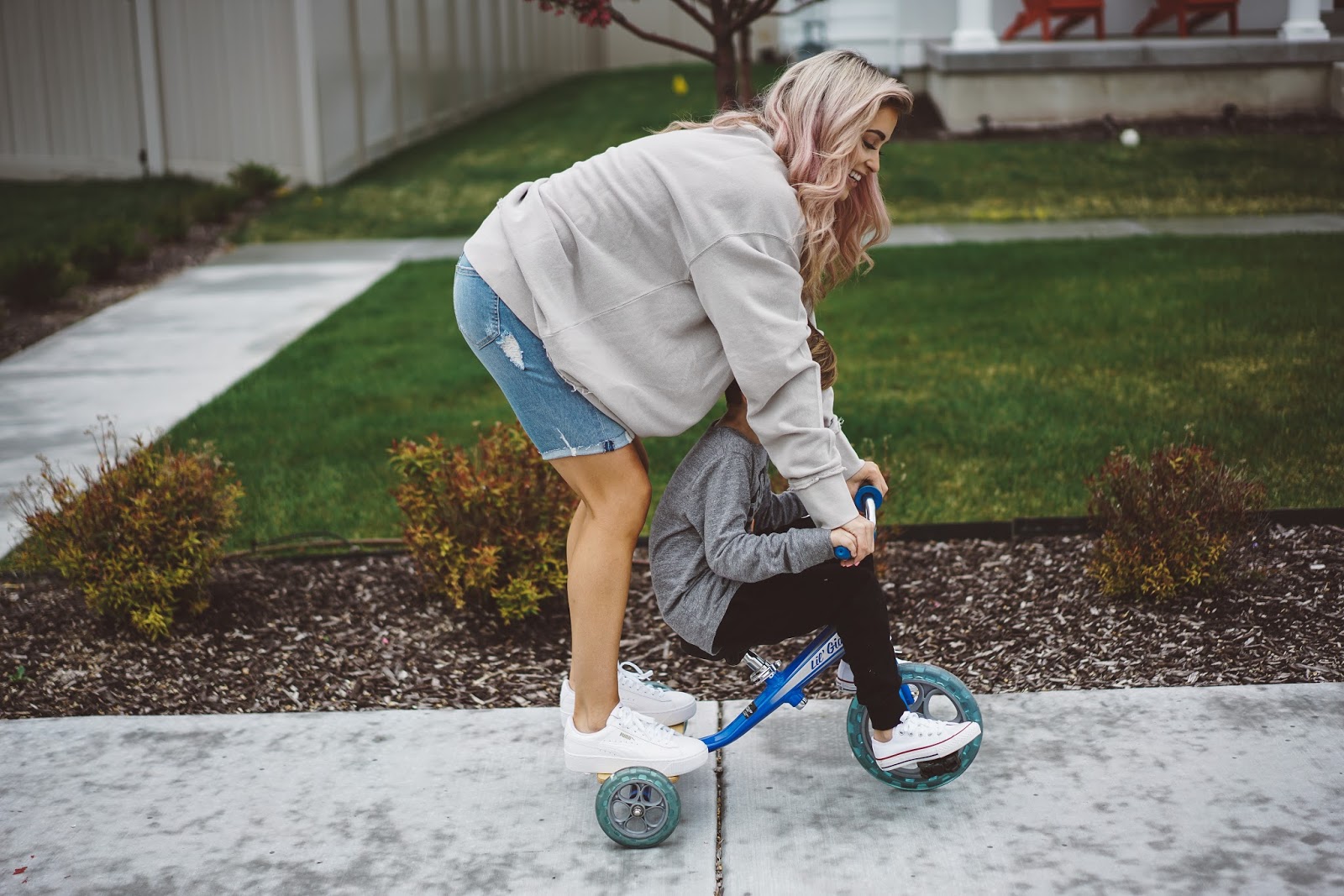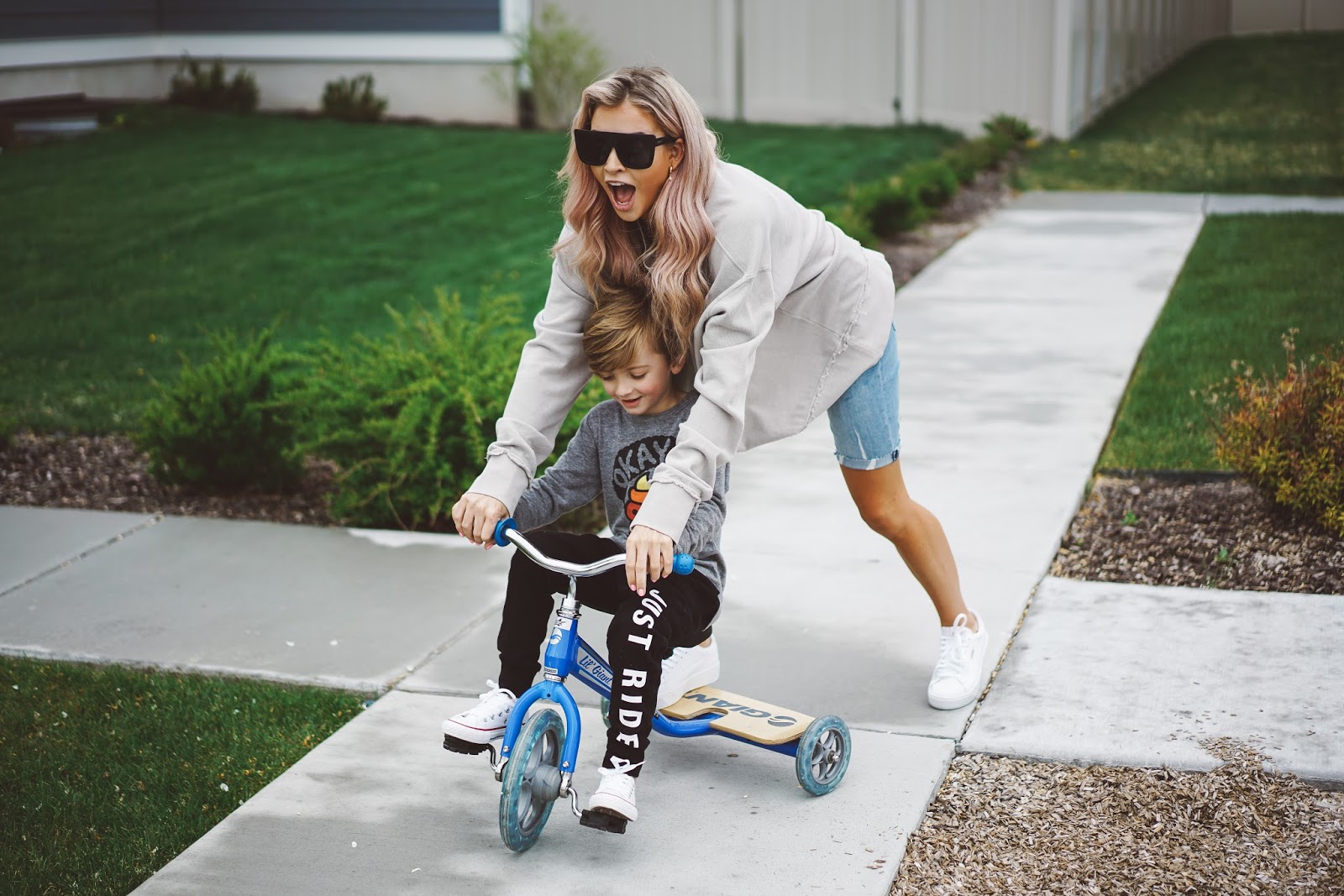 Hey guys!! It’s a beautiful day, Spring is here, the sun is shining, and I am loving every minute of it! I hope this post finds you all happy and well, and enjoying your day. So, one of the things I love the most about being a mom is being able to be part of my little guys learning and trying new things! Brod and I are all about encouraging our dudes to get out of their comfort zones and learn how to do new things and stretch themselves, even if it seems scary or makes them uncomfortable at first. We were both raised that way and as we look back it helped us to grow and stretch ourselves and more fully experience life! One of the new adventures that is going on for Hanes right now is switching from a bike with training wheels to riding a two-wheeler all on his own (with no training wheels). This is an experience I am sure many of you have been through, both when you were younger learning how to ride a bike for yourself, and as parents teaching your kids. Oh man, we are having quite the bike lesson over here haha! I love watching how Hanes takes on this new challenge, and though we have got a ways to go (the whole balancing the bike on his own is giving him some struggles), it is so cool to how excited he gets when he peddles by himself even if it is only for a few feet. There have also been some moments of fear for him as Brod or I let go of his seat and watch him ride on his own for a little bit and then end in a crash onto the grass haha!