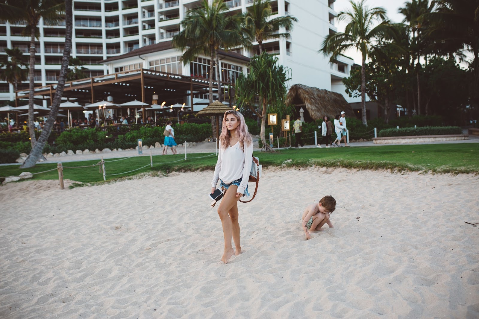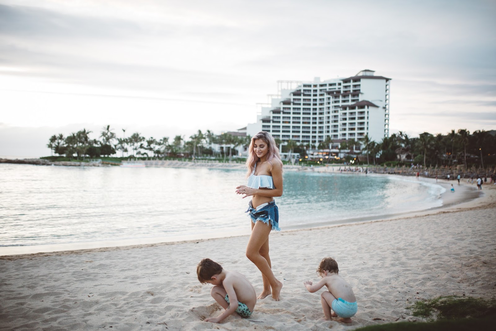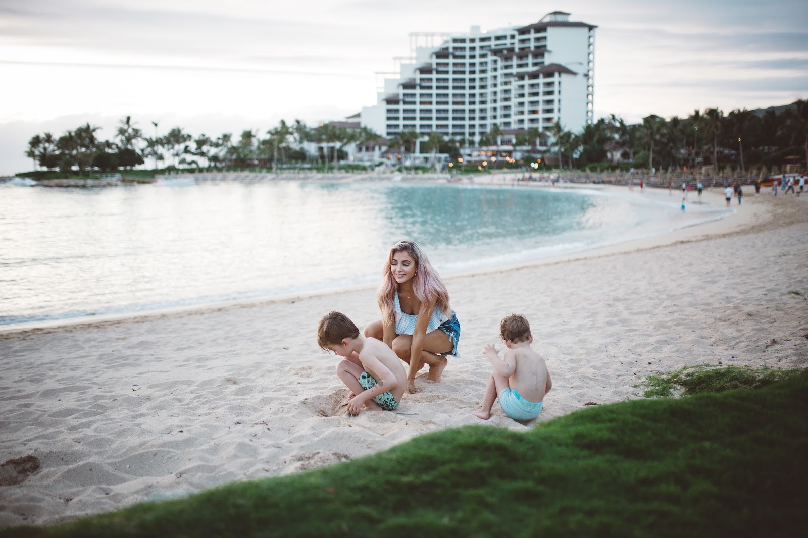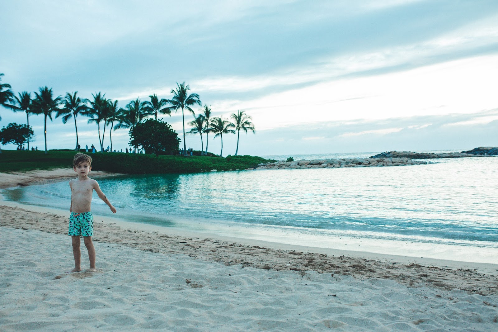 We are staying at the Four Seasons O’ahu at Ko Olina and this place is absolutely dreamy. I will be sharing more details about the resort and our experience here at a later time, but let me preface that post by saying that we love it here, and look forward to coming back already!! Day one consisted of fighting through the travel fatigue and dragging our bodies to get outside and enjoy the water! True story, right after we got in our hotel room (which is amazing by the way) we hurry and threw on our swimsuits to head down to the pool and beach. Well, after munching some snacks and taking longer than anticipated to get ready to swim, next thing we know we are all on the comfy bed and are pretty much laying and laughing half-asleep/half-delirious and exhausted from the day of travel haha! We pushed through though and got our butts out of the bed and down to the pool and then the beach, and man oh man were the boys happy we did! Swimming is definitely one of Hanes and Arrows’ favorite activities to do while we are away from home and once we hit the pool, their energy level seemed to perk right back up. After an hour or so at the pool, we walked over to the lagoon they have here at Four Seasons, and they boys played in the sand and ran from the waves as the sun began to set. It was a fantastic start to our trip and kicked off our experience here in Oahu in such a good way! As mentioned above, I will be sharing more details regarding our experience here at the resort, as well as our island adventures and exploring so make sure to check the blog in the upcoming days! Big thanks for all of you that sent suggestions our way already, we have tried some of the beaches and eating spots already and loved them! Follow along here and IG and our other platforms as well for some more aloha adventures! Happy Tuesday and I love you all!!