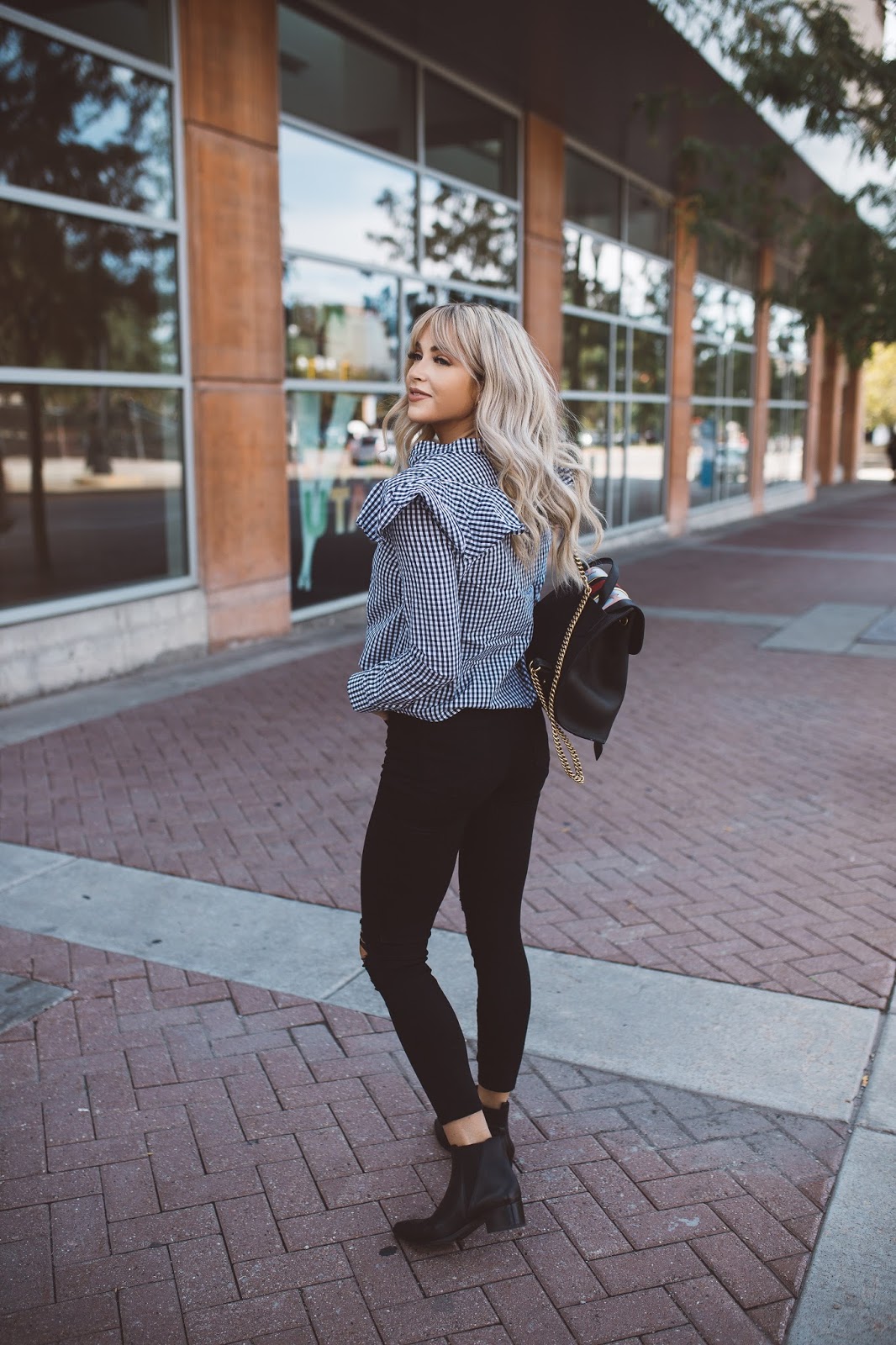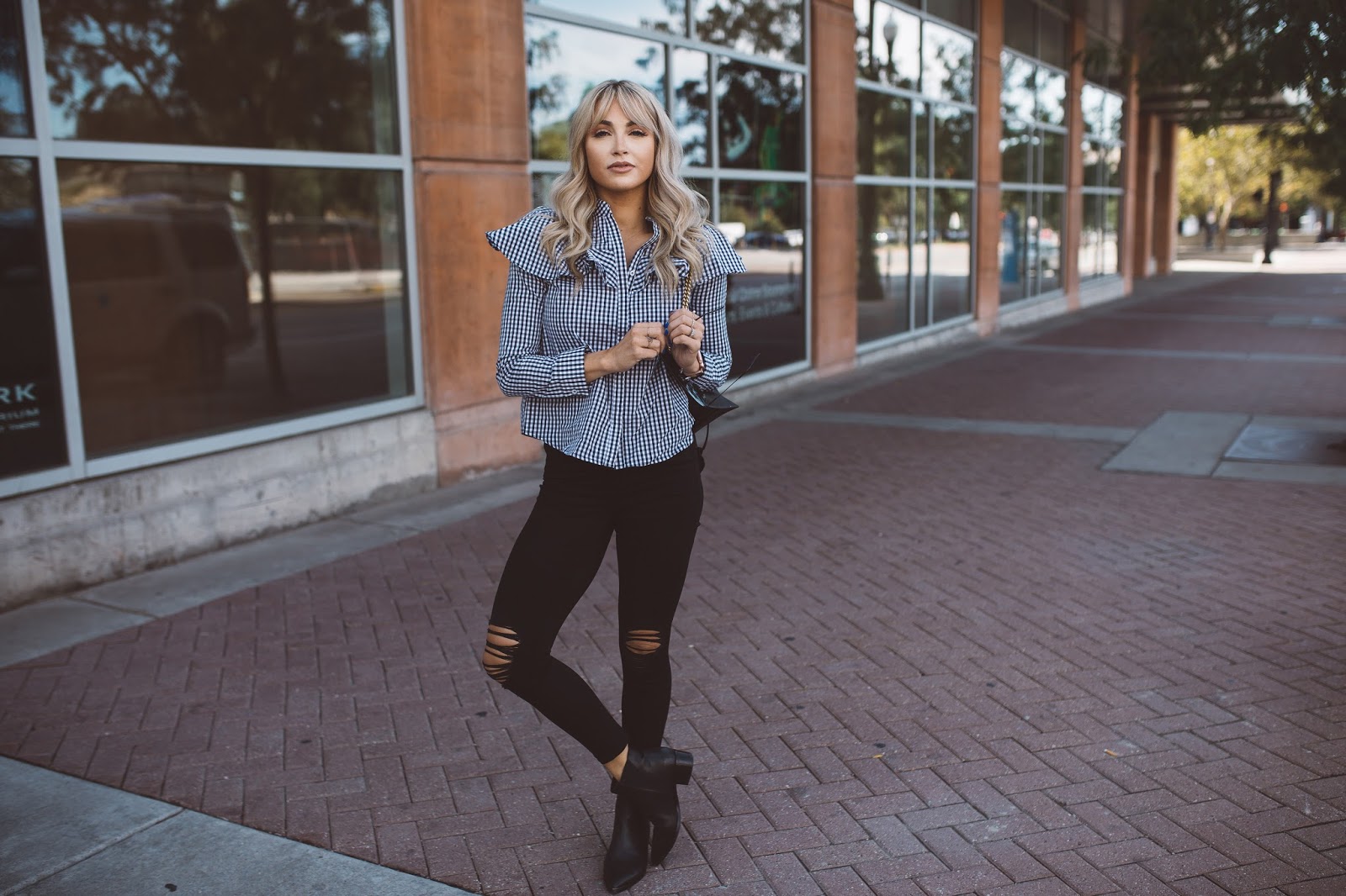 Happy humpday gang. I hope that each of you are having a great week so far. I am going to be honest, I am half falling asleep right now, so I am going to keep this short and sweet. The name of the game today is gingham. What is gingham? Look it up. I mean it, the actual meaning of the word and and it’s origination is actually quite different than what we refer to as “gingham” in today’s fashion world. I guess that is what happens when you take something that originated (gingham fabric) over 500 years ago…some details are bound to get lost in the shuffle. For today’s post sake, I will refer to gingham as the checkered pattern that we have come to know it as, and in particular, I am referring to this top from caralorenshop that I absolutely love. It’s clean, sharp, simple, and sexy and is a top that can be worn for multiple occasions. Wear it to meetings, to run errands, on a night out, to lunch…any of the above and it will be a top that looks great. I kept it simple and paired it with jeans, booties, and some shades here. I hope you guys dig it! I hope each of you has a wonderful day! Thanks for following and thanks for your love! I love you all!!